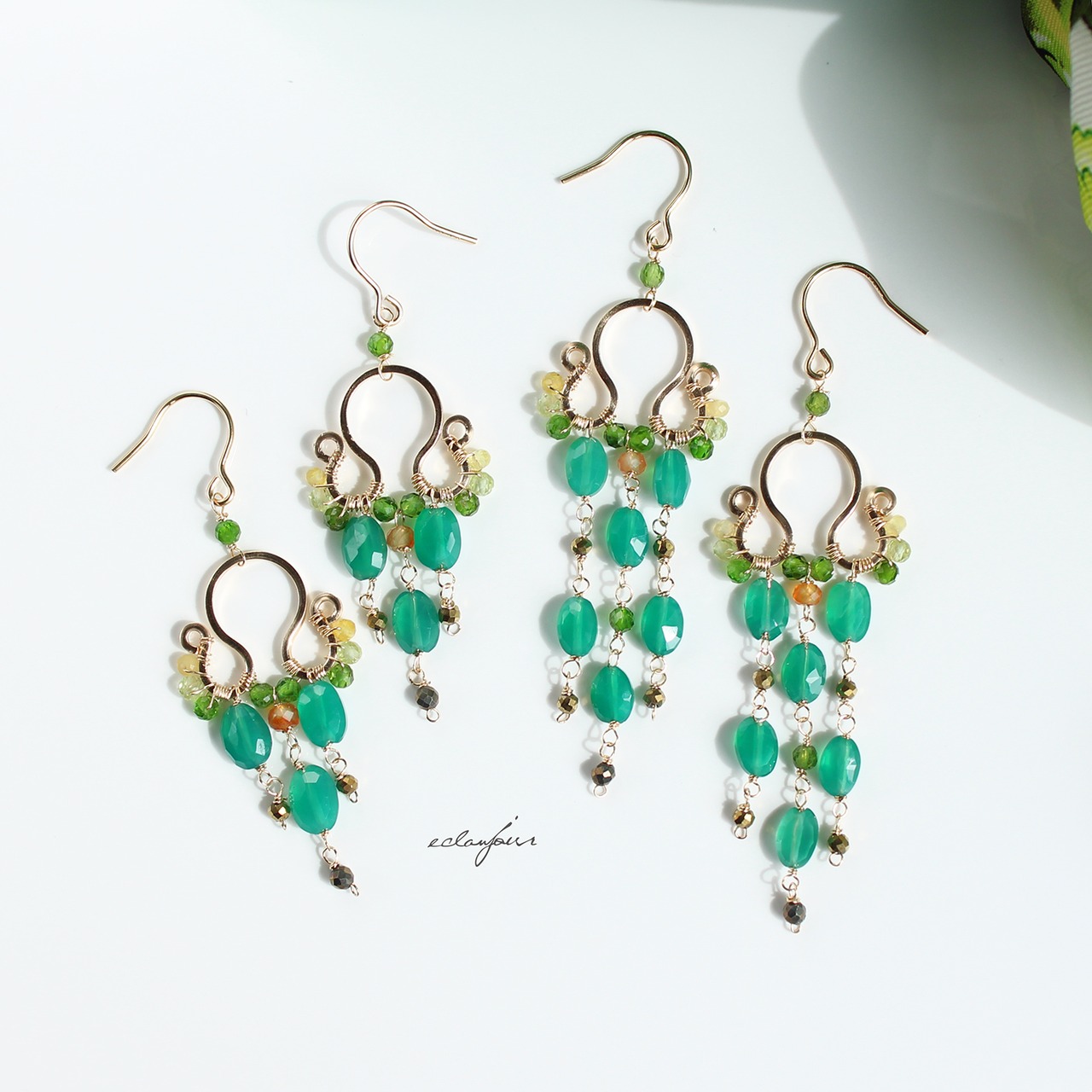 ◯グリーンオニキスが3つ下がった華やかで使い勝手の良いショートタイプになります。