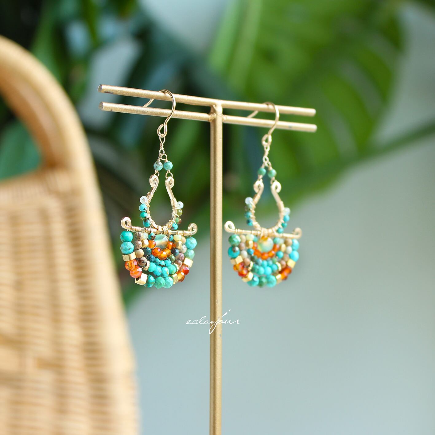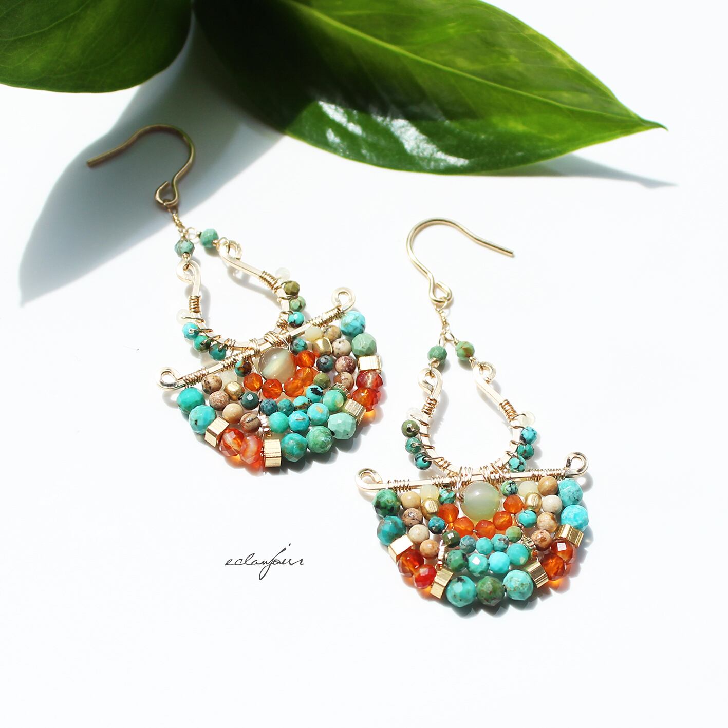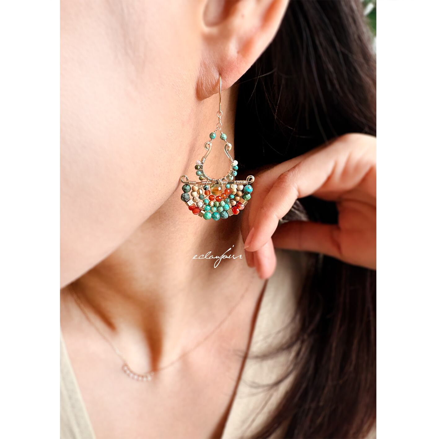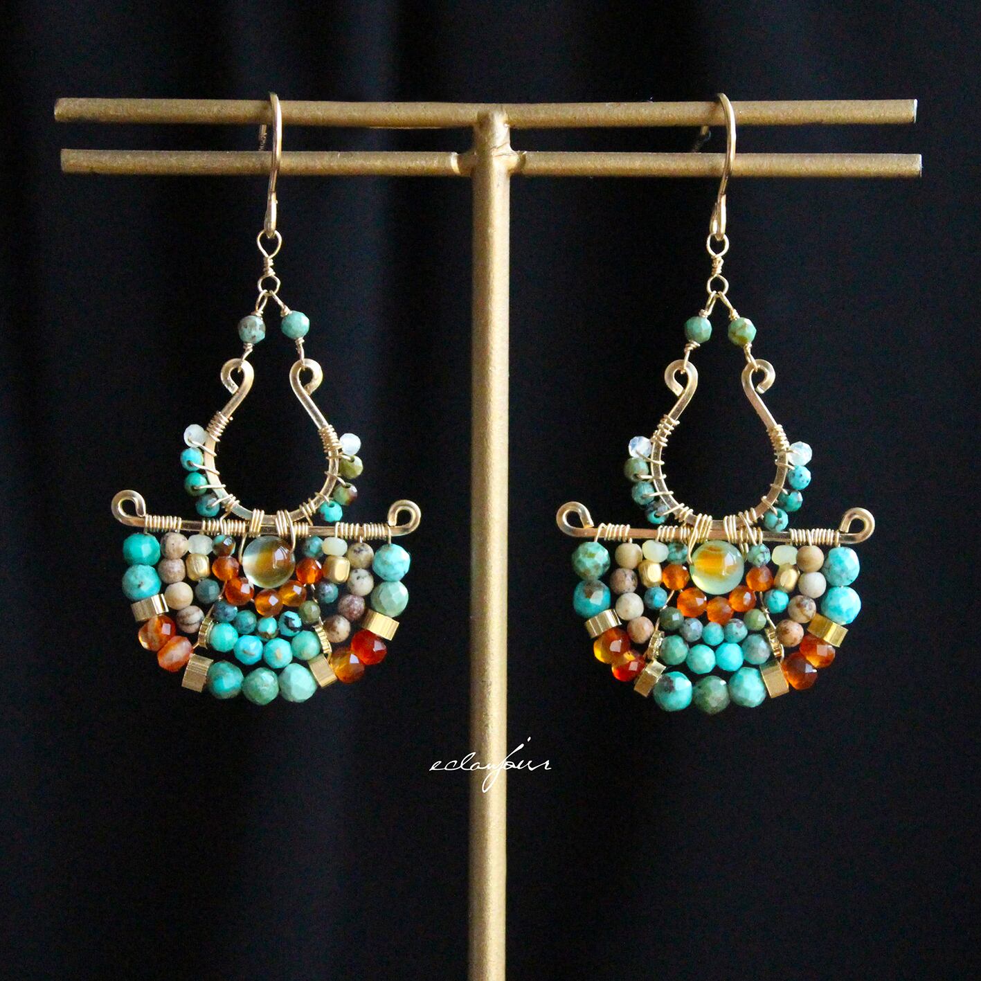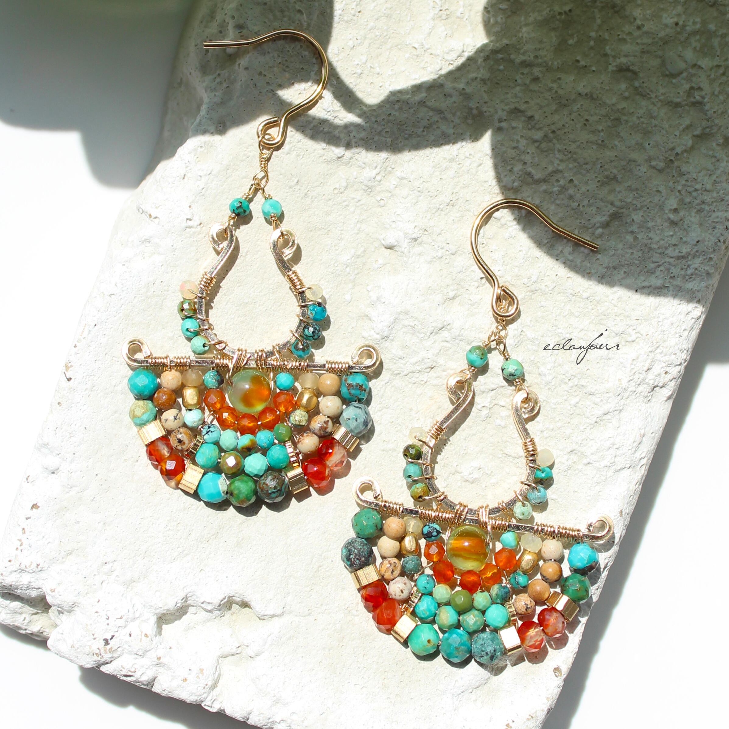 本作品では、私の得意とするターコイズの緑青色で表現し、カーネリアンの赤とターコイズの青が生み出す、生命力あふれるコントラストをお楽しみください。さらに、馬蹄形に加工したフレームと半円状にビーズをあしらったフレームを別々で制作しワイヤーで繋げたデザインは、