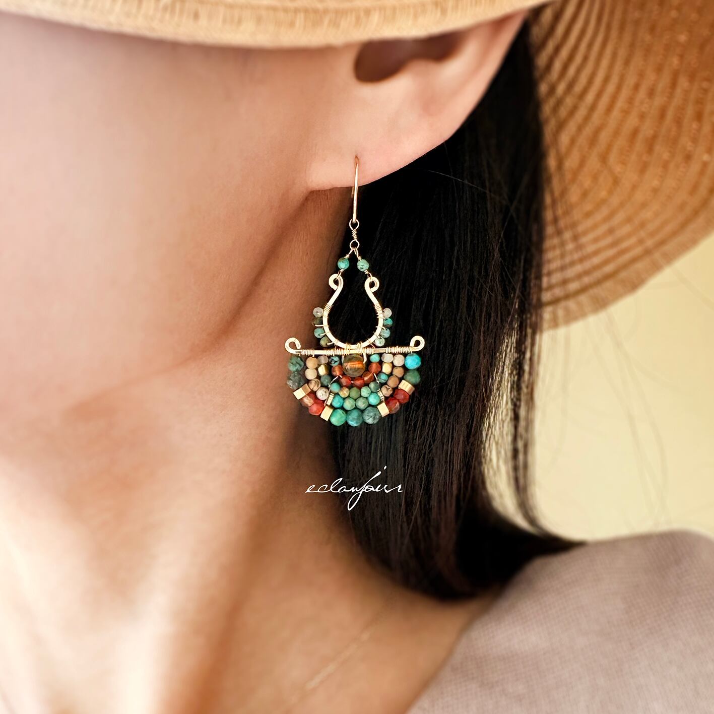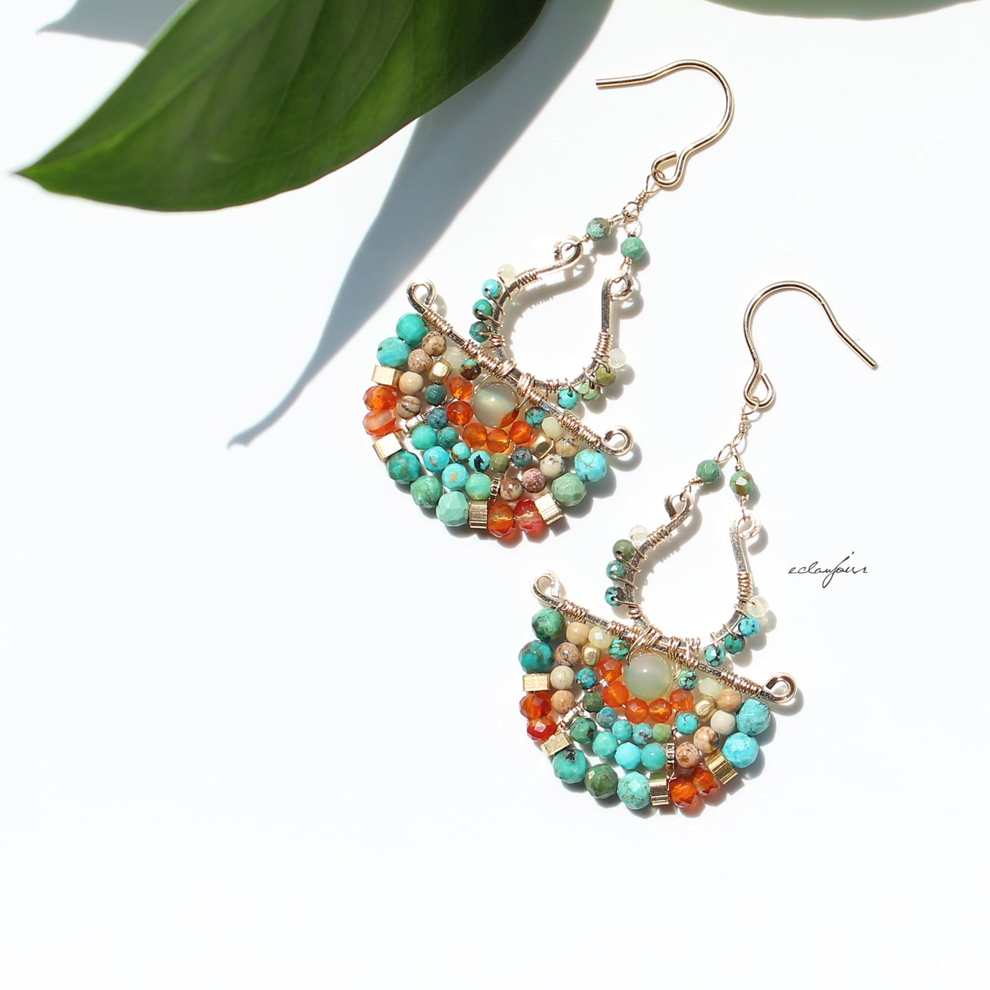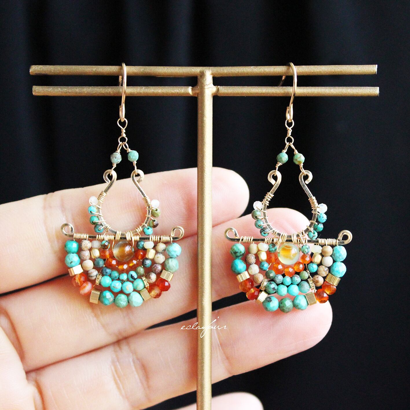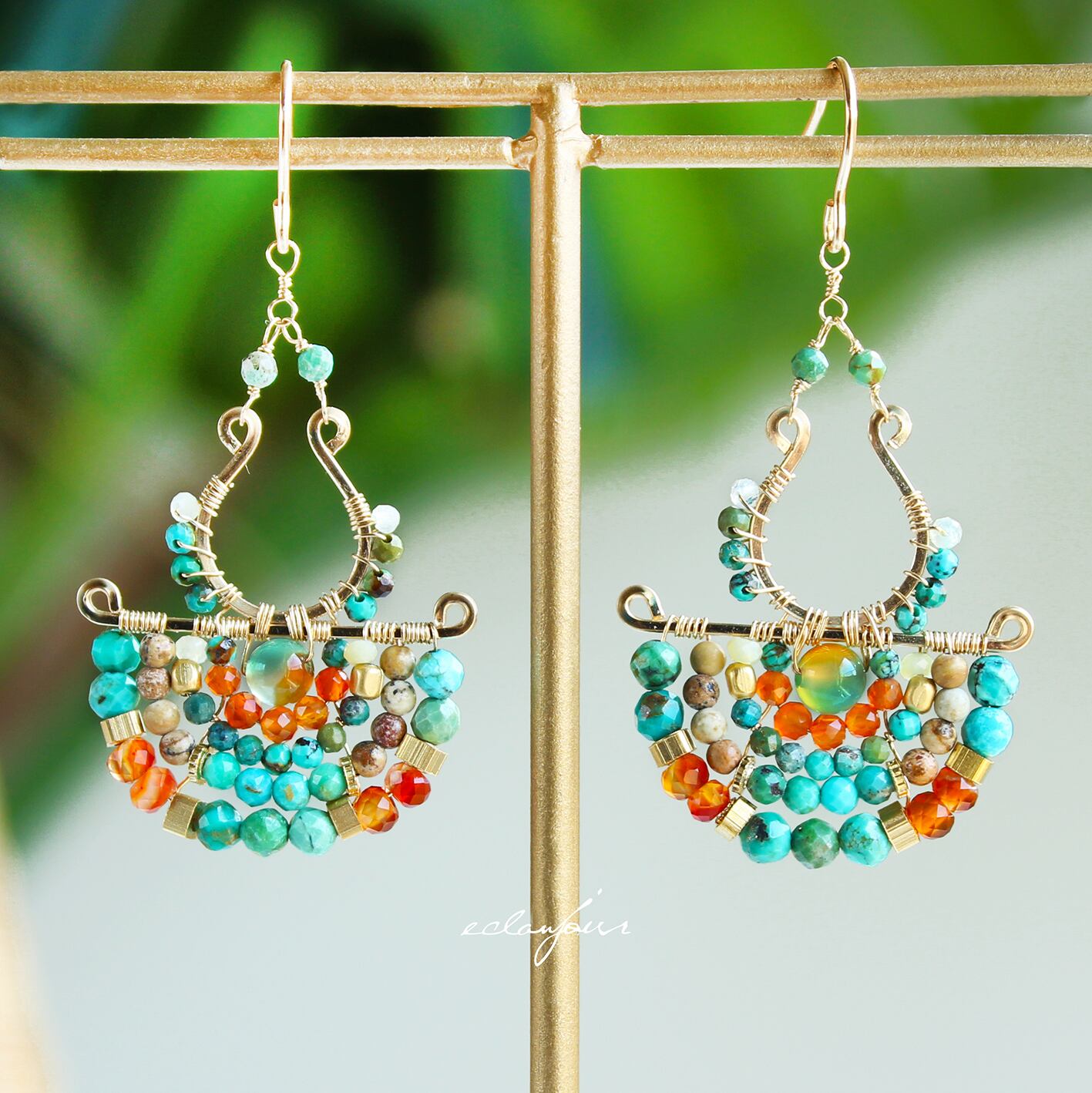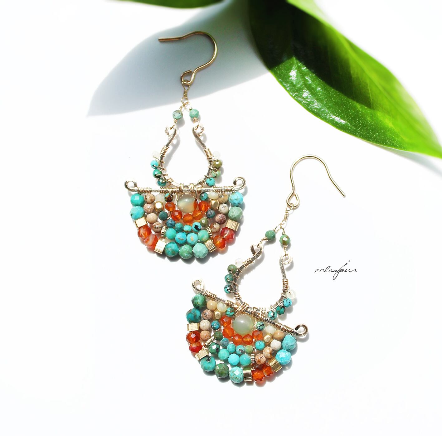 本作品では、私の得意とするターコイズの緑青色で表現し、カーネリアンの赤とターコイズの青が生み出す、生命力あふれるコントラストをお楽しみください。さらに、馬蹄形に加工したフレームと半円状にビーズをあしらったフレームを別々で制作しワイヤーで繋げたデザインは、