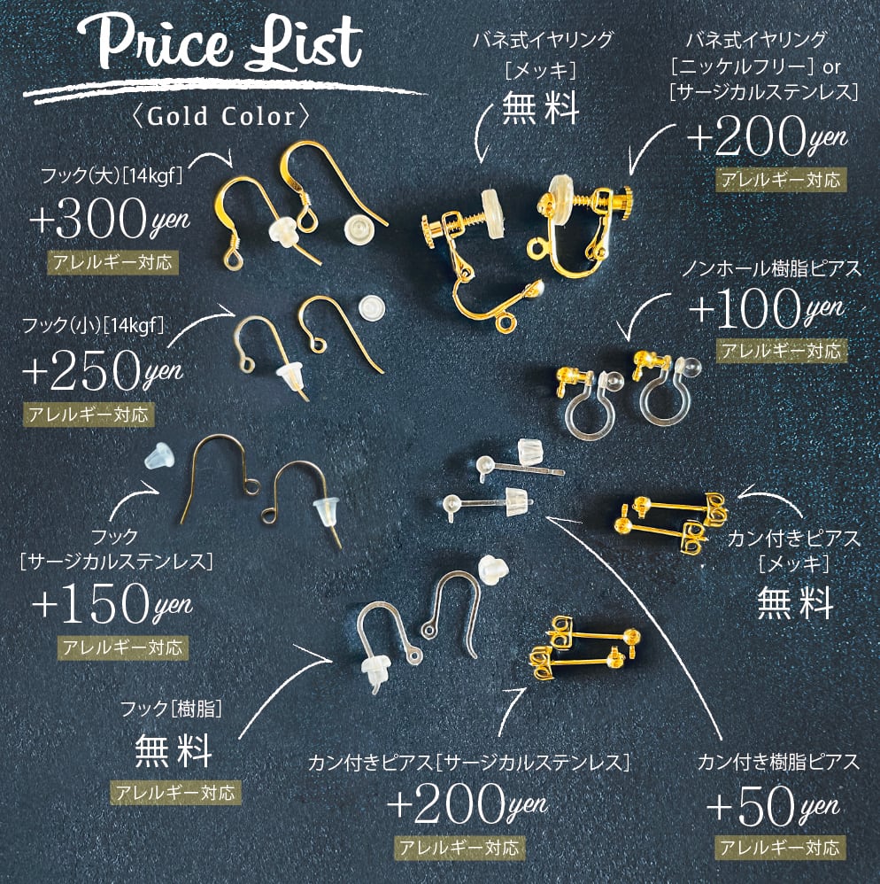 ・サージカルステンレス製バネ式イヤリング金具(医療用アレルギー対応素材/痛くなりにくいシリコンカバー付き)+200円