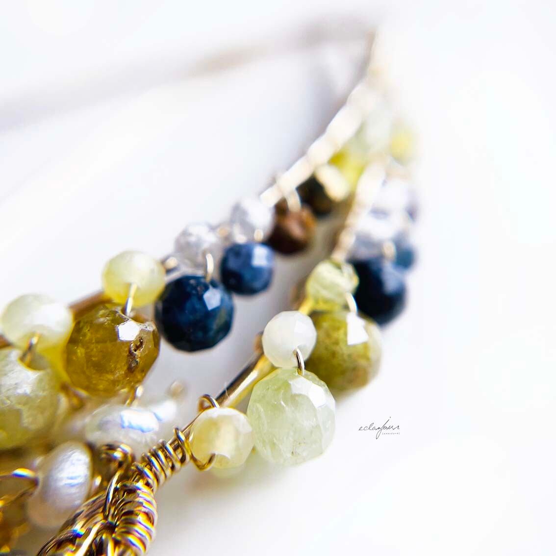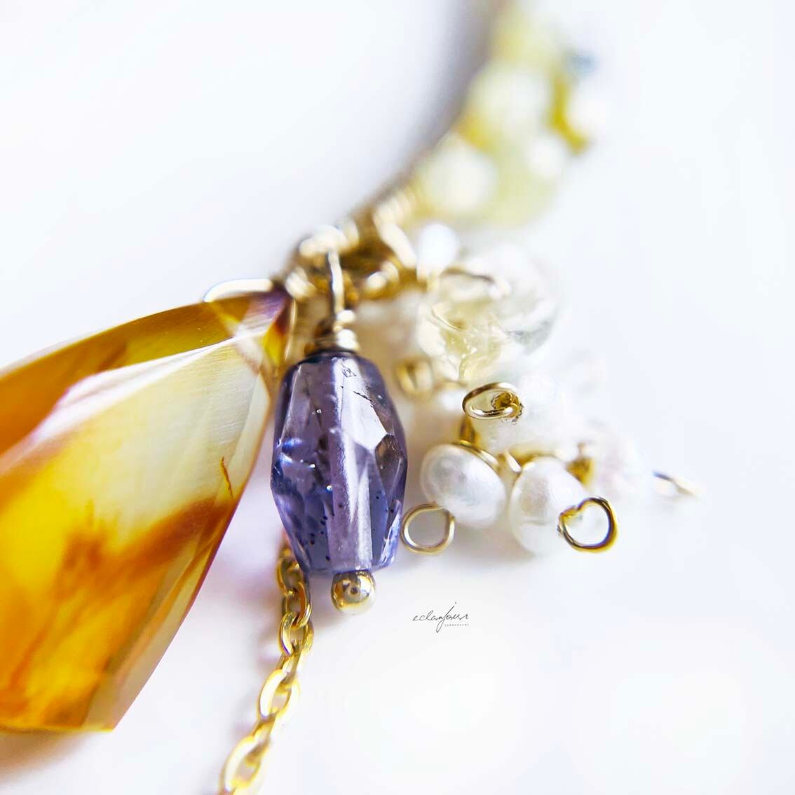 トゥルンとした蜂蜜色のシトリン、深いオリーブカラーのグロッシュラーガーネット、心落ち着くアイオライトの薄紫、優しい光沢の淡水パール、