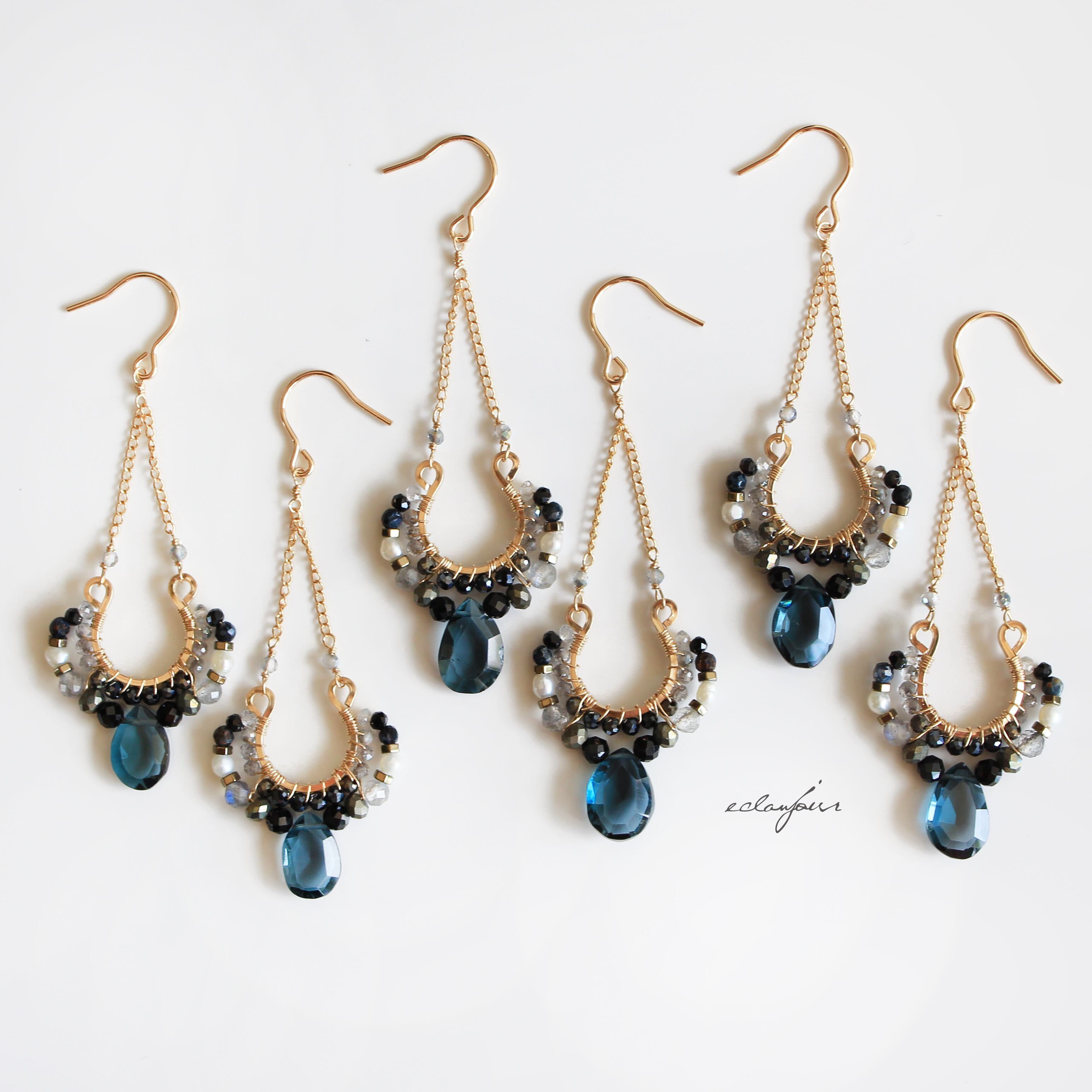 天然石:ロンドンブルートパーズ、ブラックスピネル、ラブラドライト、ピーターサイト、トパーズ(イエローコーティング)、淡水パール、ゴールデンパイライト